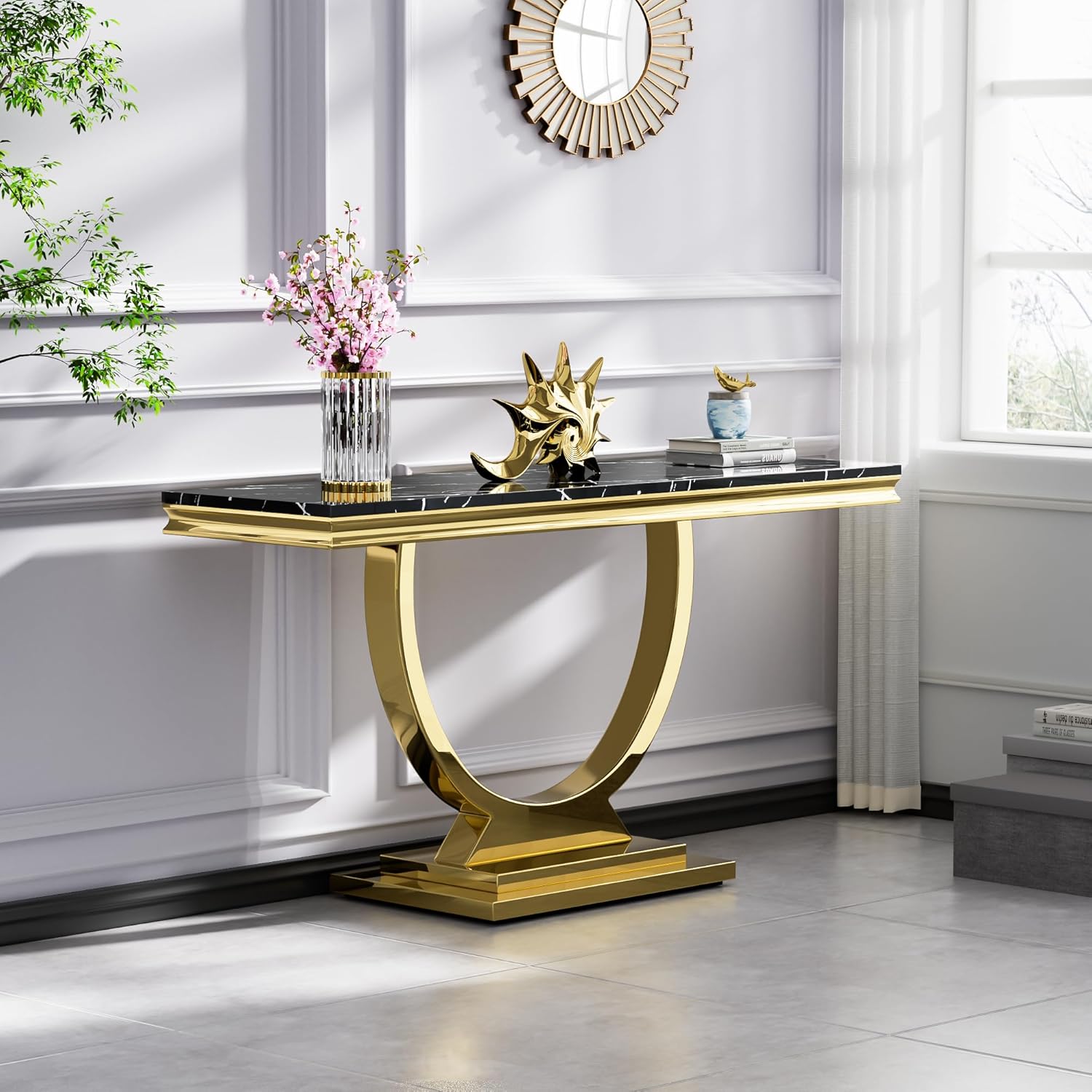 A striking console piece that pairs a sleek faux marble top with a bold U-shaped stainless steel base in polished gold or chrome—perfect for elevating entryways, living rooms, or hallways with a touch of modern luxury