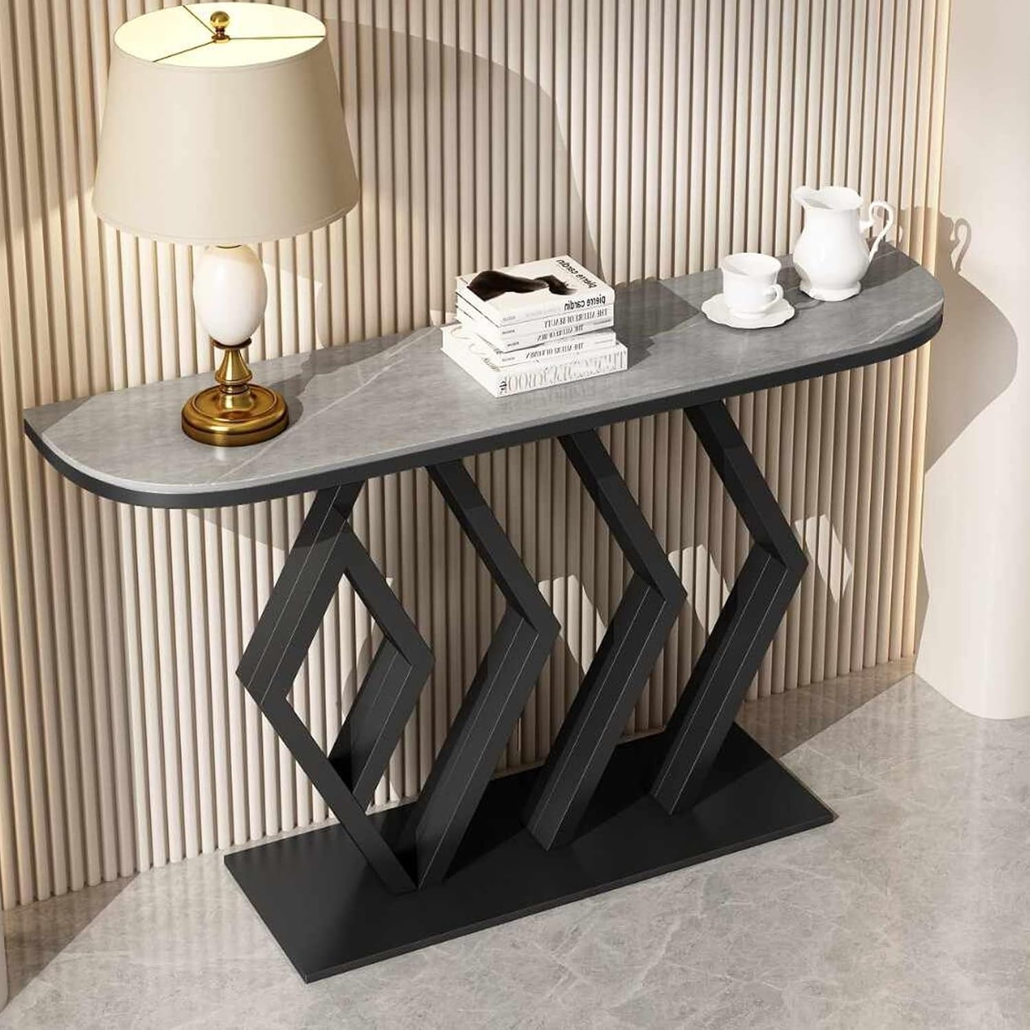 A striking console table that combines a natural rock-textured slab top with a bold geometric metal base, adding a touch of industrial elegance to your entryway or hallway.