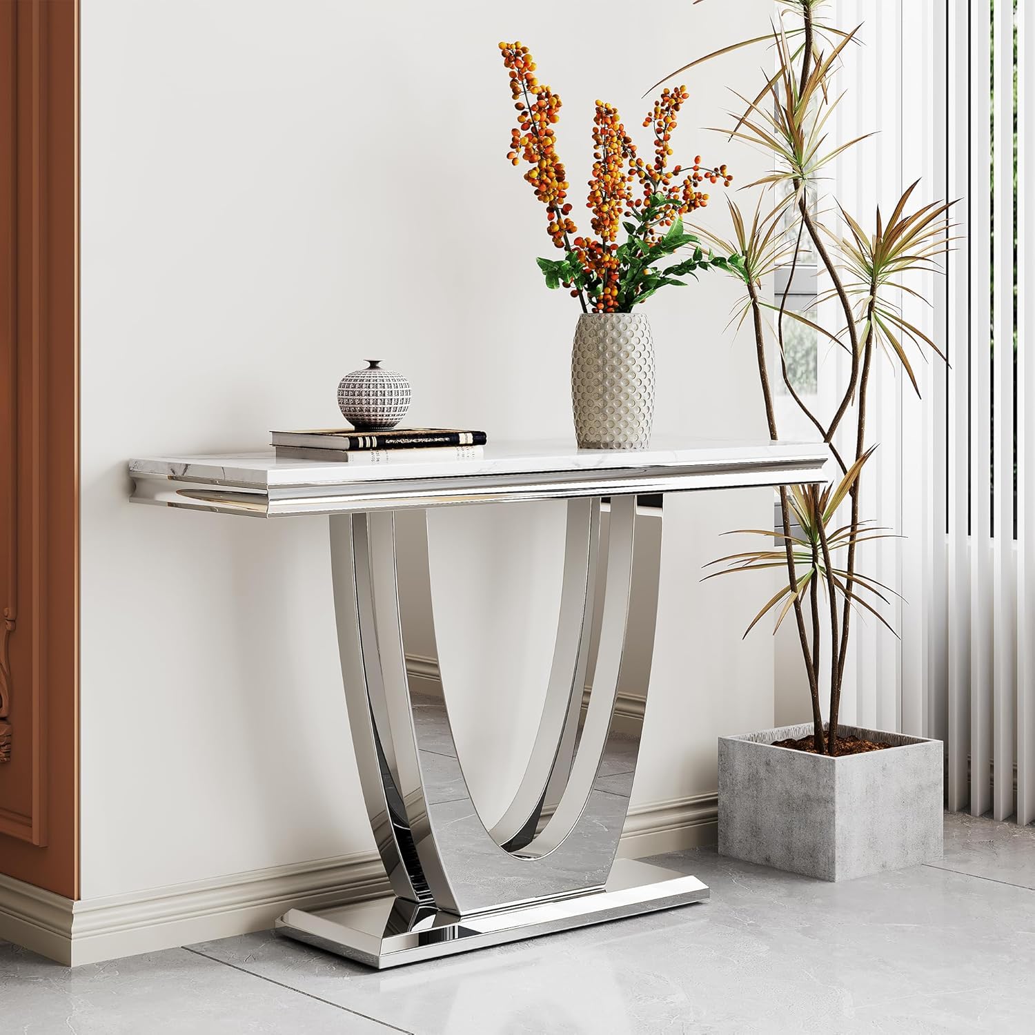 A contemporary accent piece featuring a thick faux-marble top gracefully supported by a polished U-shaped stainless-steel pedestal base. This elegant console adds both sophistication and structural balance to entryways, living rooms, or hallways.
